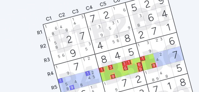 The Naked Quadruple expands on the logic of Naked Triples but uses four cells and four digits within a unit (row, column, or block). If four cells in a unit collectively hold exactly four unique candidates, those digits must fill one cell each and are eliminated from other cells in the same unit.